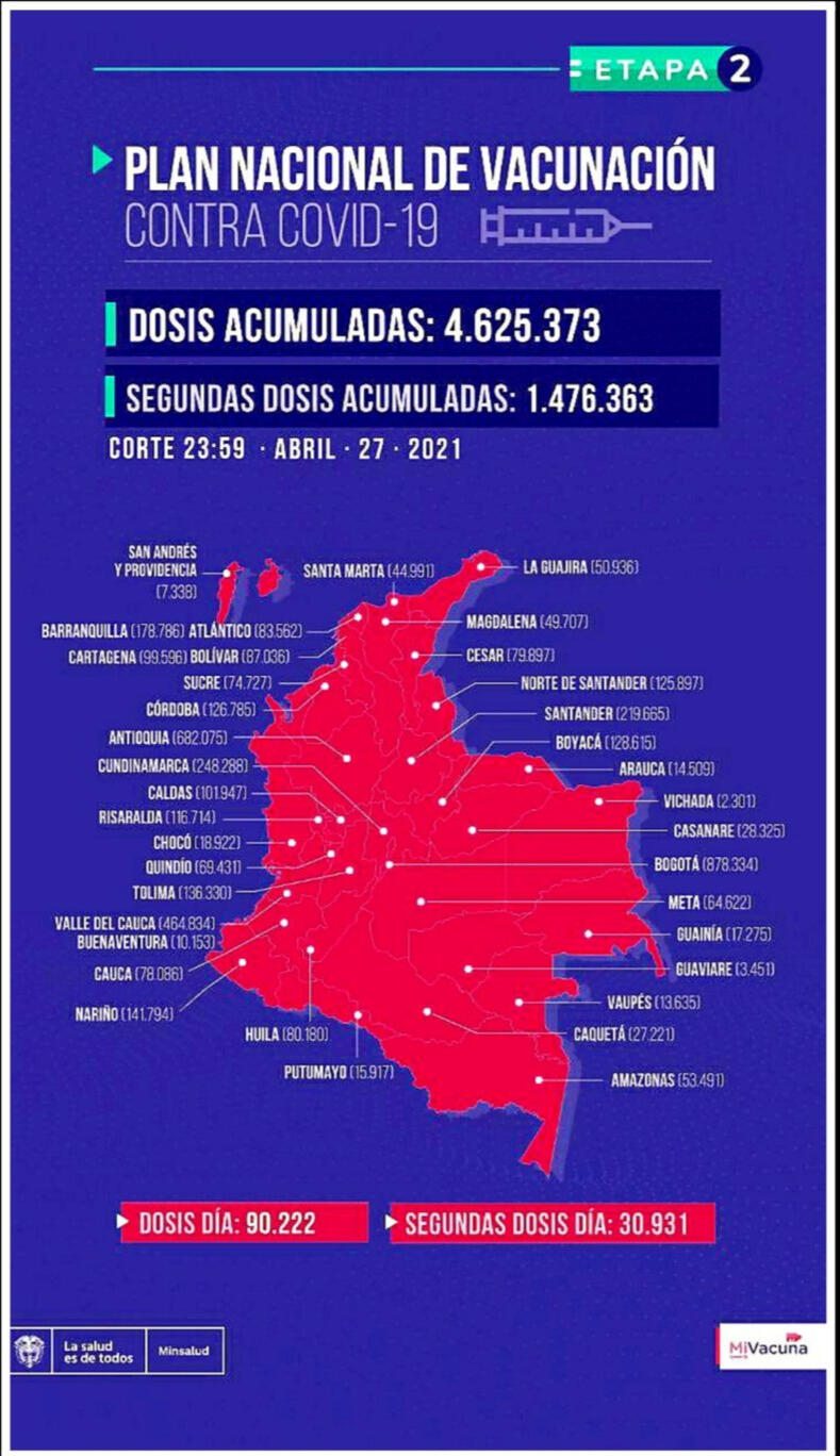 Colombia lleva una semana registrando más de 400 muertes diarias por coronavirus, una cifra que ha puesto al límite a los hospitales en las principales ciudades. Este lunes 26 de Abril, se notificó de 448 nuevos fallecimientos por covid, con lo que acumula 71.799 muertes en la pandemia.